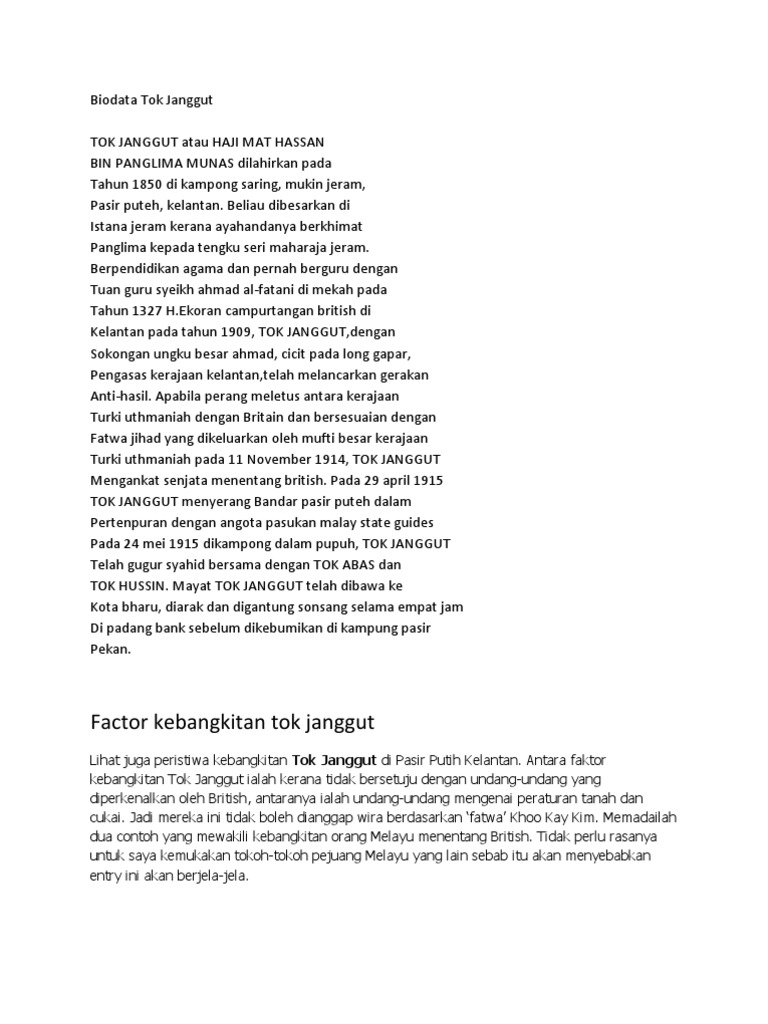 Nasionalisme di malaysia sehingga perang dunia kedua (tok janggut). Contact tok janggut on messenger. Tok janggut terkorban dalam serangan. Maafkan sang faqir cikgu, sang faqir tidak berniat untuk menderhaka. Haji mohd hassan bin munas was nicknamed tok janggut ('old man with a beard' in malay). About press copyright contact us creators advertise developers terms privacy policy & safety how …. Mayat beliau diarak ke seluruh pekan kota bharu. Mysumber dimaklumkan bahawa calon pt3 pada tahun 2017 dikehendaki melaksanakan kerja kursus (tugasan) sejarah iaitu membuat kajian tentang satu peristiwa bersejarah di tempat tinggal calon. Tok janggut menyahut seruan menentang british di pasir puteh. Kerja kursus sejarah tok janggut tok janggut, engku besar jeram, penghulu adam dan che sahak merbol mengetuai kajian kes sejarah perjuangan tokoh tempatan pages 1 16 text version anyflip. Translate · jan 28, 2021 · kerja kursus sejarah pt3 2020 penentangan tokoh tempatan. Kerja kursus sejarah 2011 sejarah diri dan keluarga sejarah 21/2 kerja kursus. Tok janggut mendapat pendidikan agama di makkah dan mahir dalam bidang.