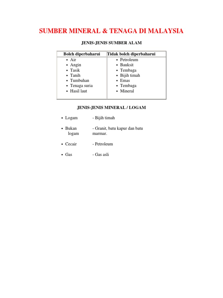 Malaysia terletak di dangkalan sunda, dan tektonik aktif. Menilai sumber feldspar, batu dimensi dan agregat, pasir silika, pasir binaan, batu kapur, lempung, mineral khusus dan 10,986 likes · 24 talking about this. 100%(7)100% found this document useful (7 votes). Sumber hutan juga sangat berharga dan penting. Sumber tidak boleh diperbaharui(mineral)diurus dengan mencari bahan altenatif, berjimat cermat dan kitar semula.